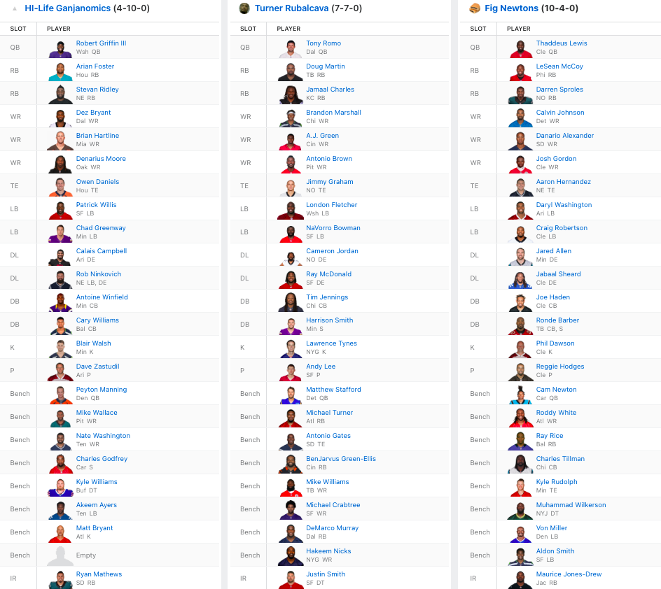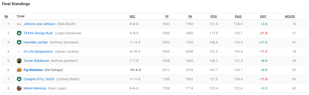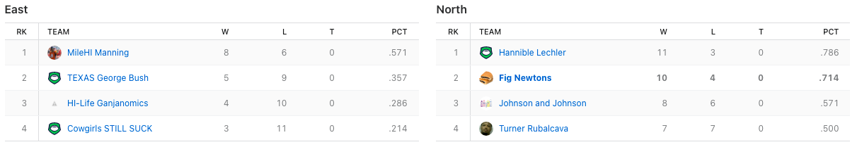 It was clear from the very beginning that there was some issues in quality between the two divisions. The North Division saw the worst team - the defending champion Law Firm - come out of the 14-game regular season with a 7-7 record, which would have been just one game short of the divisional title in the incredibly poor East Division. Interestingly, the three teams in the East Division that were just awful this season were each original CSFFL members - Coach Rubs, the Ganja Farmers, and the Sneaky Greek. The divisional crowns were taken by two newcomers in Q and MileHI Manning, while the Toll Booth, the other rookie, also pulled through with a winning record during the regular season. Q dominated the regular season en route to an 11-3 record, good enough to hold off Commissioner Stalin for the divisional title and the 1-seed.