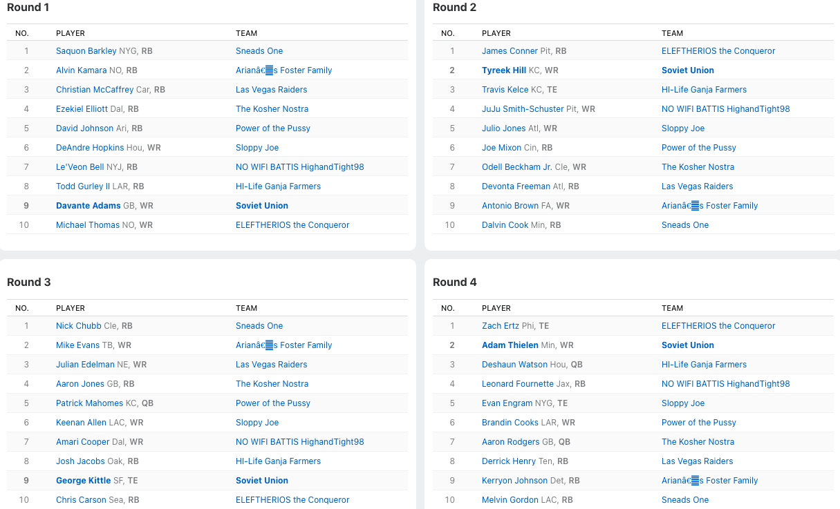 No big surprises in the first few rounds, with the exception of Coach Rubs reaching for JuJu at 14th overall when pretty much every other WR was available