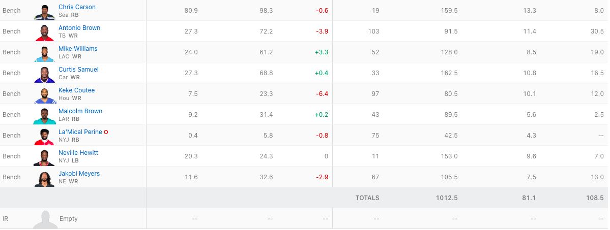 The Kosher Nostra vs. Coach Rubs - Derek Carr and Kareem Hunt, two of the heroes in Logan’s Week 14 Wild Card upset over Djavan, fell flat on their face here in the semis as they combined for just 5.5 total points. Pat Mahomes did his best and Logan Thomas somehow put up 17.5, but Coach Rubs didn’t have enough with his final score of just 162. The Kosher Nostra’s team, meanwhile, got 32.5 points from his two linebackers alone en route to a massive 251.5 total. Big Mike only had 3 of his 17 starters put up single digits, with eight of them topping 14.5 on the week as he cruised into the championship game