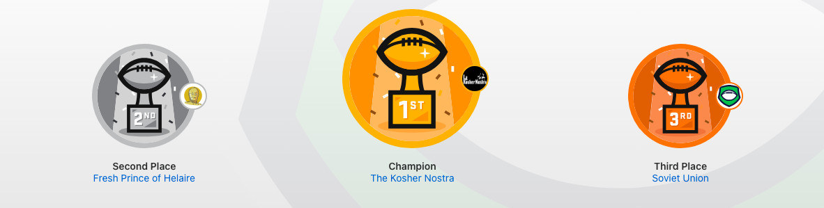 The Kosher Nostra vs. Brock - Brock came into this game as the greatest Cinderella story the league had ever known. They came into the playoffs as a division champion (the franchise’s first), but as just the 6th highest scoring team overall. They then upset the Soviets, the highest scoring regular season team, in the semifinals to book their place in the finals for the first time in franchise history, where they came face to face with the two-time champ, the Kosher Nostra. In an obvious bid to win, Brock inserts running back Salvon Ahmed (he played for Miami at the time, since you’re curious) into the starting lineup to continue the Cinderella run in the championship game against the league’s top team