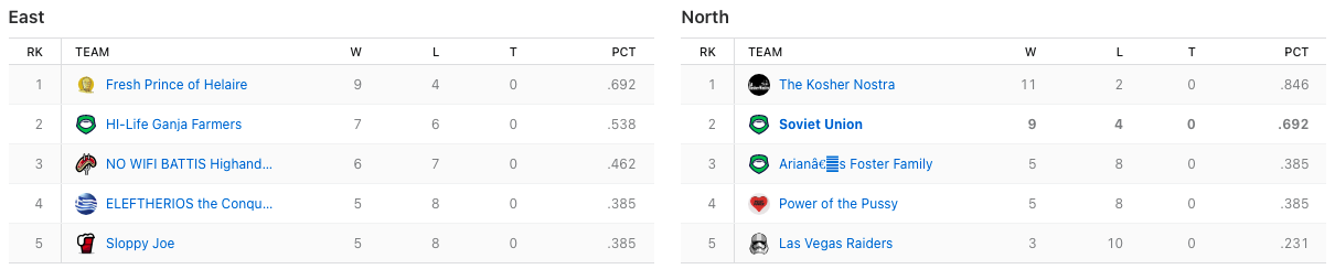 The Kosher Nostra once again clinched the North Division title (their 5th since joining the league in 2014) and the #1 seed with an 11-2 record. Brock pulled out a 9-4 record en route to the franchise’s first ever division title and a berth in the semifinals, while the Soviets matched the 9-4 record and were given the 3-seed as the league’s top wild card. The Ganja Farmers were the only other team with a winning record, while Coach Rubs lucked out as his 6-7 record was enough to get him not just a playoff berth, but the 5-seed. For the second year in a row, we had a 5-8 team qualify for the postseason. This time, it was the Law Firm winning the 4-team tiebreaker at the expense of the Sneaky Greek, the Toll Booth, and Sloppy Joe. Q rounded out the league with a rock solid 3-10 record in the ultimate championship hangover.
