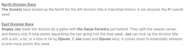 2021 Regular Season - Week Thirteen League Manager Note link to other weeks down here 2021 Regular Season Page on ESPN Back to Season History Page