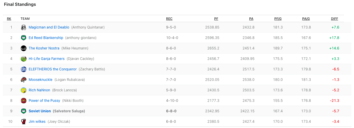 For the second straight season, we had the HI-Life Ganja Farmers and the Law Firm win their respective divisions and earn first round byes. Q put up a ton of points during the regular season to snag the top wild card, and the Kosher Nostra returned for the playoffs for the first time in two seasons with a moldy 8-6 record. We had two .500 teams in Coach Rubs and the Sneaky Greek round out the playoff field that did not feature either of the previous two champions - Boof or Sloppy Joe - as well as the perennial semifinalist Soviets. Who else is there? Oh yeah, the Toll Booth. She didn’t set lineups, and didn’t pay until almost the 2024 season. So that’s good